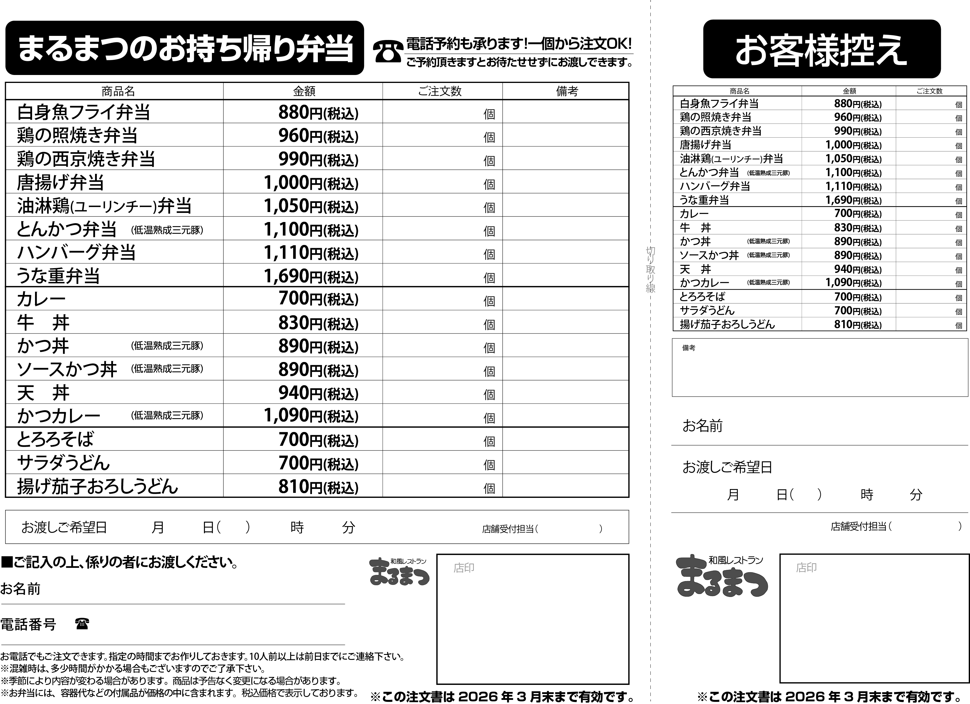 当店ではお持ち帰り用のメニューも充実しております。 店頭での販売はもちろん、お電話での予約も承っております。 お気軽にお問い合わせください。